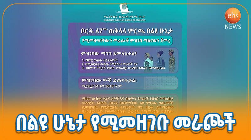 ቦርዱ በልዩ ሁኔታ የሚመዘገቡ መራጮች ምዝገባ እስከ ሚያዚያ 24 ቀን 2018 ዓ.ም ድረስ የሚቆይ መሆኑን ገልጿል።